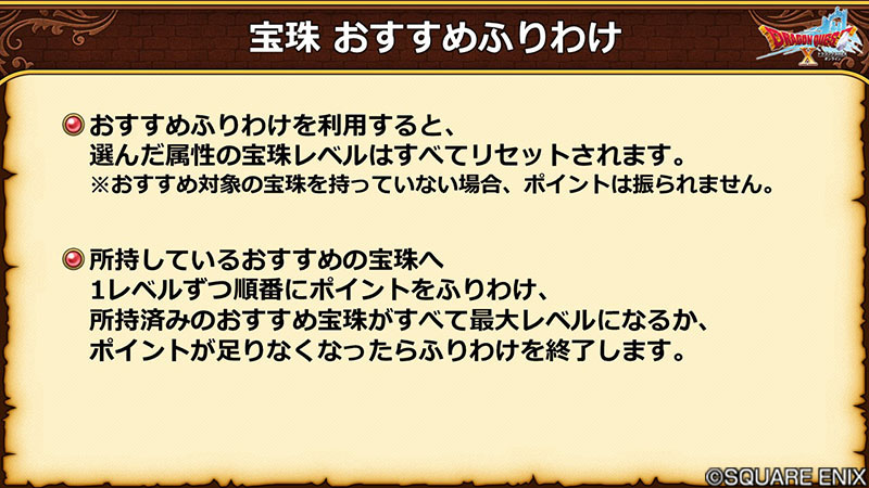 ・「おすすめ振り分け」を利用すると、選んだ属性の宝珠が全てリセットされてしまうので注意