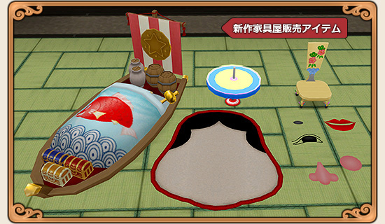 新春宝船フトン、コマのテーブル、羽子板チェア、福笑いのラグ