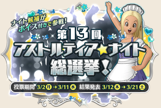 | 内容 | プレイヤーの投票によって、アストルティアのナイトを決める |