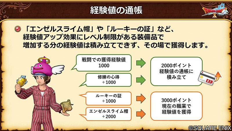 ・稼ぎやすい職業で経験値を貯めて、別の職業で受け取れる ・カンストした職業での戦闘が 無駄にならない |