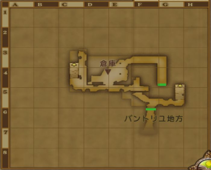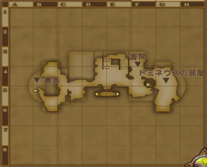 廃墟のドミネウス邸 全体MAP > エテーネ王国 > バントリユ地方 廃墟のドミネウス邸_3階 廃墟のドミネウス邸_2階 黒宝箱(E5):ロイヤルチャーム 【生息モンスター】 LV 94 HP 3422 マッドファルコン 鳥系 出現 1-2匹 EXP 1501(特訓3) ドロ サンドフルーツ大地の羽毛 廃墟のドミネウス邸_1階 【生息モンスター】 LV 94 HP 3422 マッドファルコン 鳥系 出現 2-4匹 EXP 1501(特訓3) ドロ サンドフルーツ大地の羽毛 廃墟のドミネウス邸_地下1階